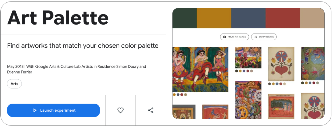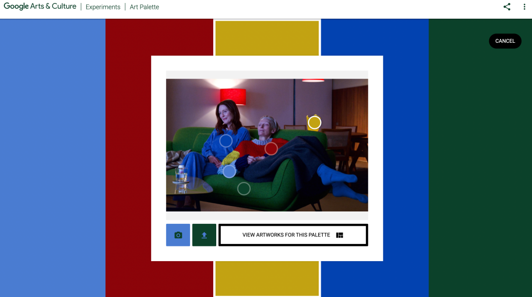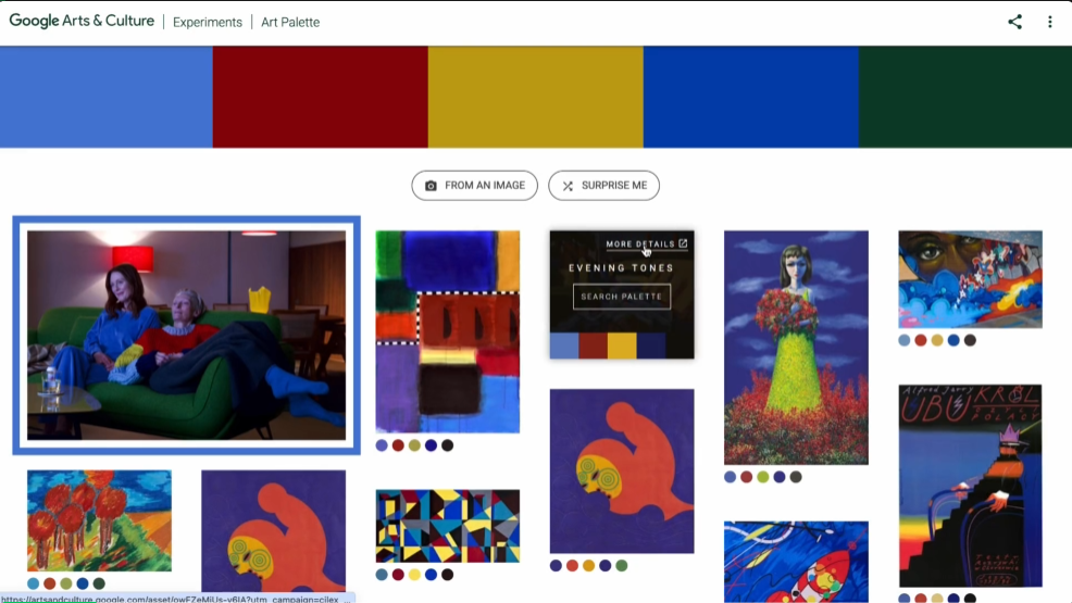 它的玩法很简单。我们上传一张照片,或者直接在调色板上选择五种颜色,系统便会从全球 1500 多家文化机构的海量藏品中,找出与这些颜色匹配的艺术作品。
