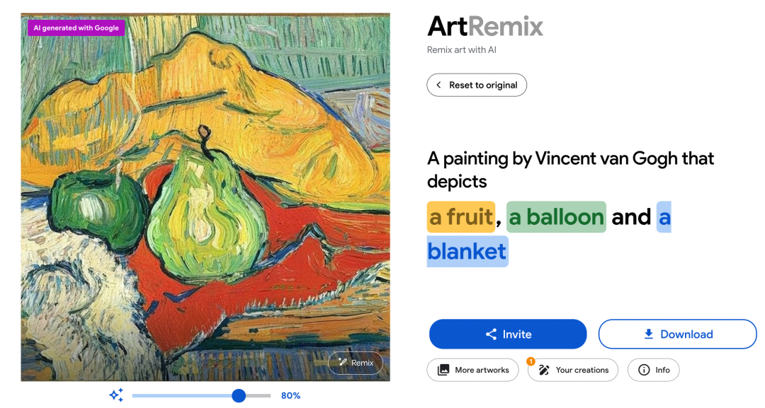 或者选择「ArtRemix」按钮,谷歌的 AI 图像生成模型 Imagen 会根据描述性的文字提示,随机生成这幅画的一个全新版本。