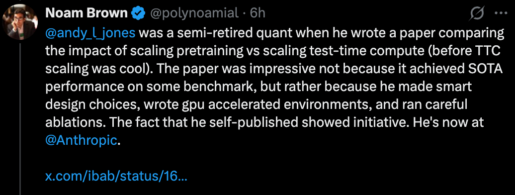 Noam Brown 特别提到,导师的推荐在这里起了很大作用,因为仅凭简历甚至论文来评估一个研究者的潜力是很困难的。