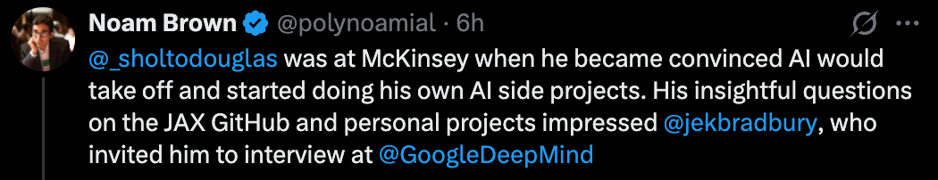 最近,OpenAI 资深研究科学家 Noam Brown 在 X 上分享了几个真实故事,证明了通过个人努力和巧妙策略,即使没有传统学术履历,也能获得机会。