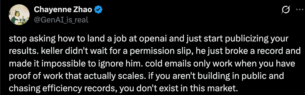 正如 Chayenne Zhao 所说,「别再问怎么才能在 OpenAI 找到工作了,直接开始宣传你的成果吧。Keller 没等什么许可,他直接打破了纪录,让人无法忽视。只有当你拥有真正可扩展的工作成果时,陌生邮件才有效。如果你没有公开开发项目,没有追求效率记录,你在这个市场里就不存在。」