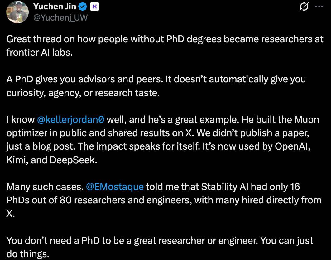 你不需要博士学位就能成为优秀的研究员或工程师,你只需要「just do things」,主动展示能力、做有影响力的独立项目、在开源社区贡献有深度的想法、通过改进现有工作证明实力。