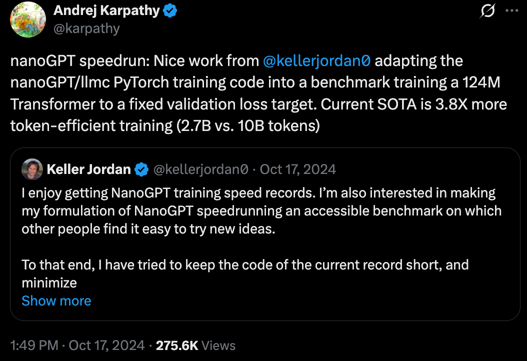 然而,Keller 真正吸引 OpenAI 注意的,是他发起的 NanoGPT speed run 项目。这个项目基于 Andrej Karpathy 的 nanoGPT 框架,旨在优化训练一个 124M 参数的 Transformer 模型,以达到特定验证损失目标,同时最大化 token 利用效率。