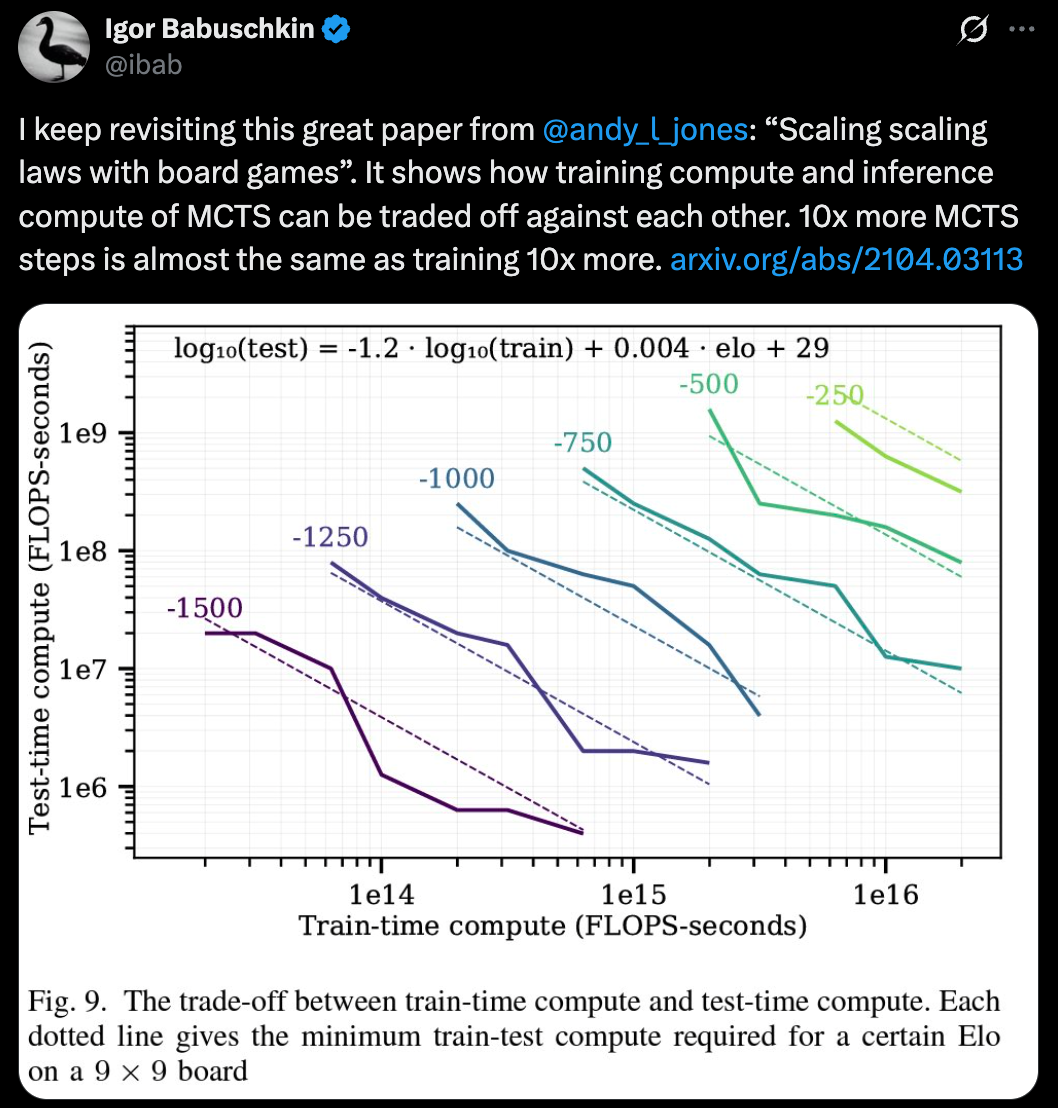 xAI 联合创始人 Igor Babuschkin 专门发帖表示,他不断回顾 Andy L. Jones 的精彩论文《Scaling Scaling Laws with Board Games》,说它展示了 MCTS 训练计算量与推理计算量之间相互权衡,增加 10 倍的 MCTS 步骤几乎等同于 10 倍的训练量。