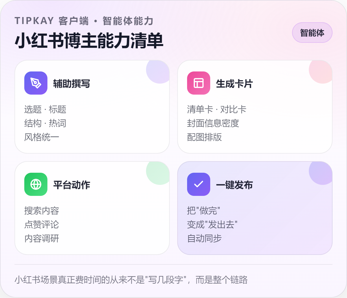 小红书场景真正费时间的从来不是"写几段字",而是整个链路: