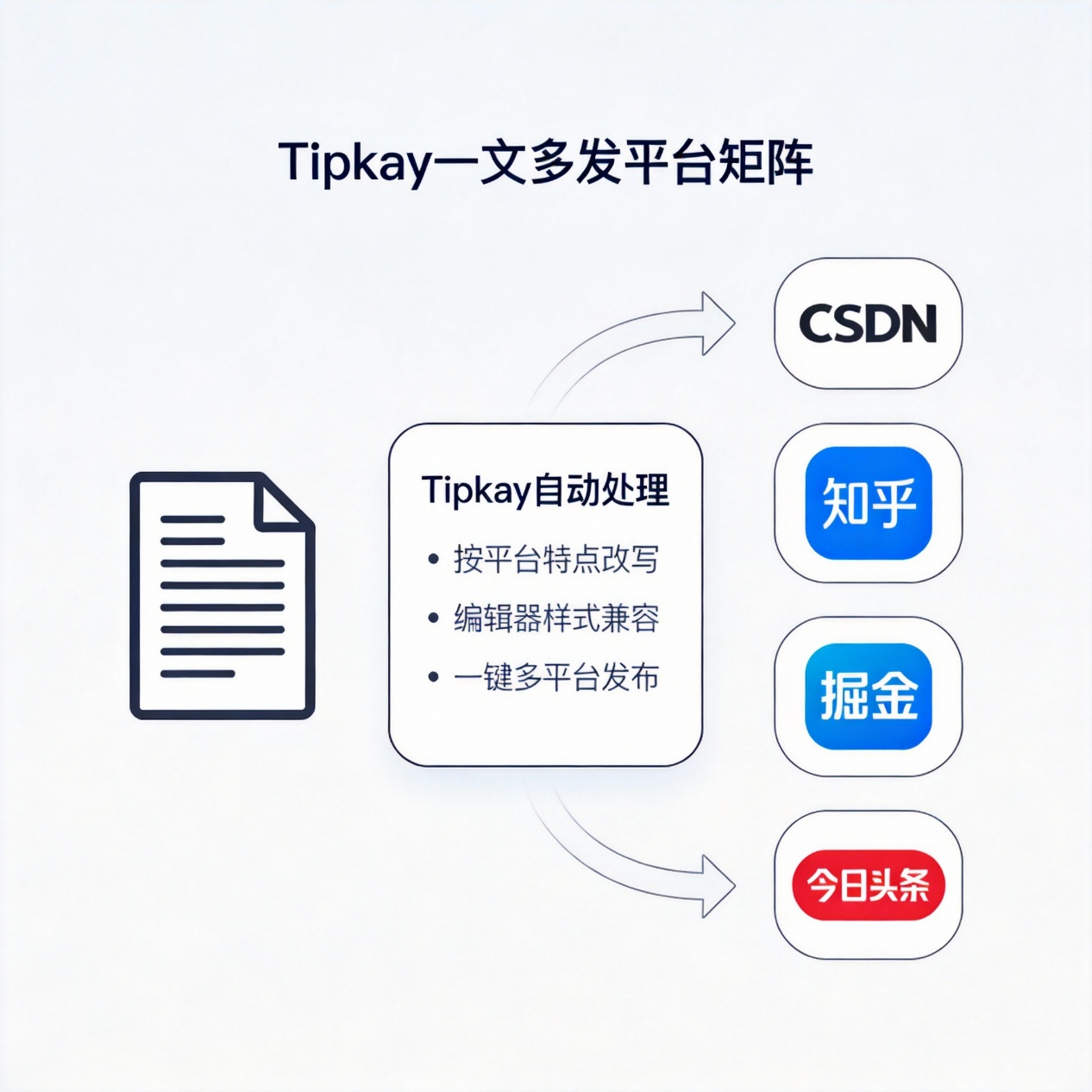 Tipkay 的思路是把这些变成"发布前自动处理"的一段流程:按平台特点改写、按平台编辑器做样式兼容,然后一键多平台发布。
