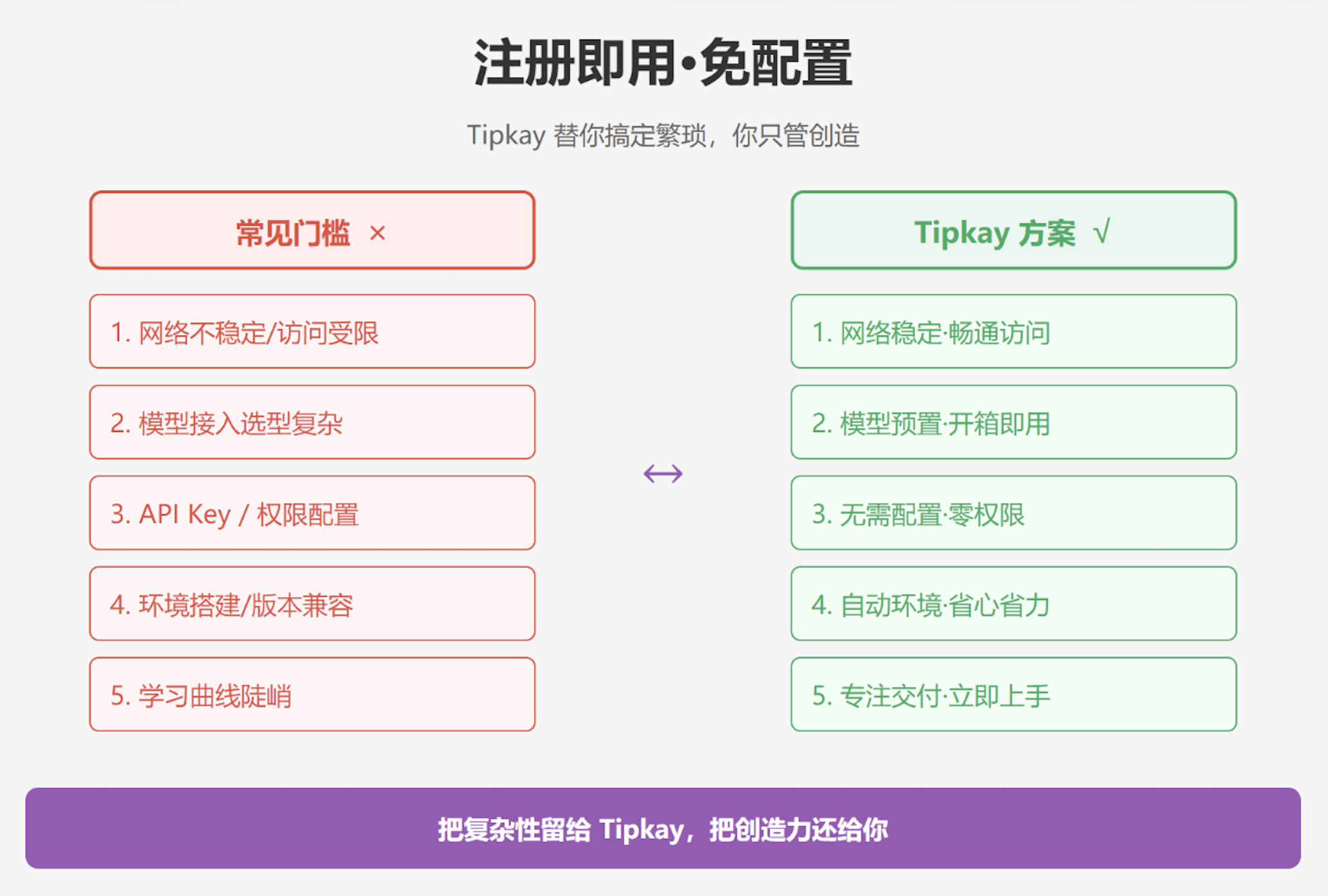 Tipkay 的产品取向是把这些复杂性尽量屏蔽掉,让你 注册就能用,把注意力留给"我要交付什么结果"。