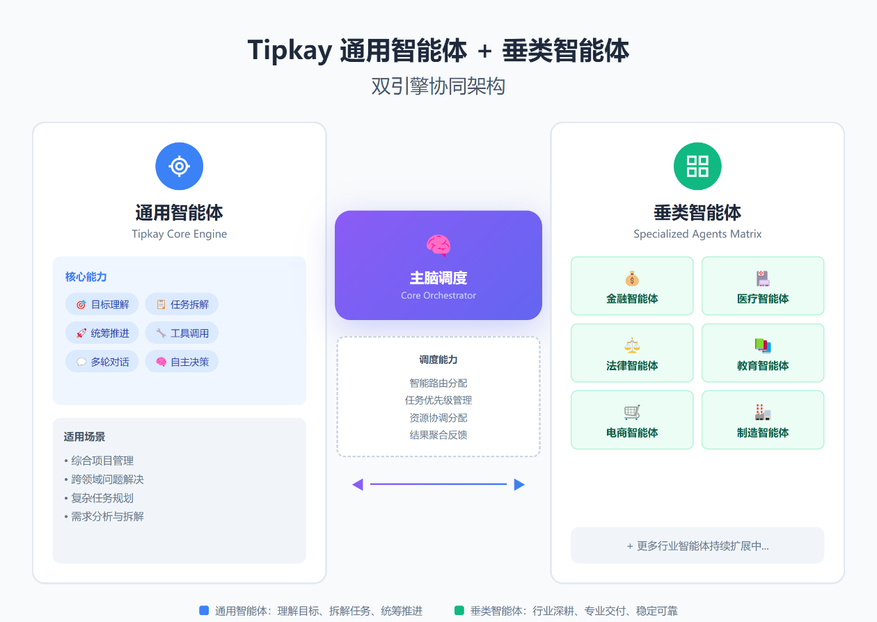 你可以把 Tipkay 理解成一套"可执行的智能体平台":