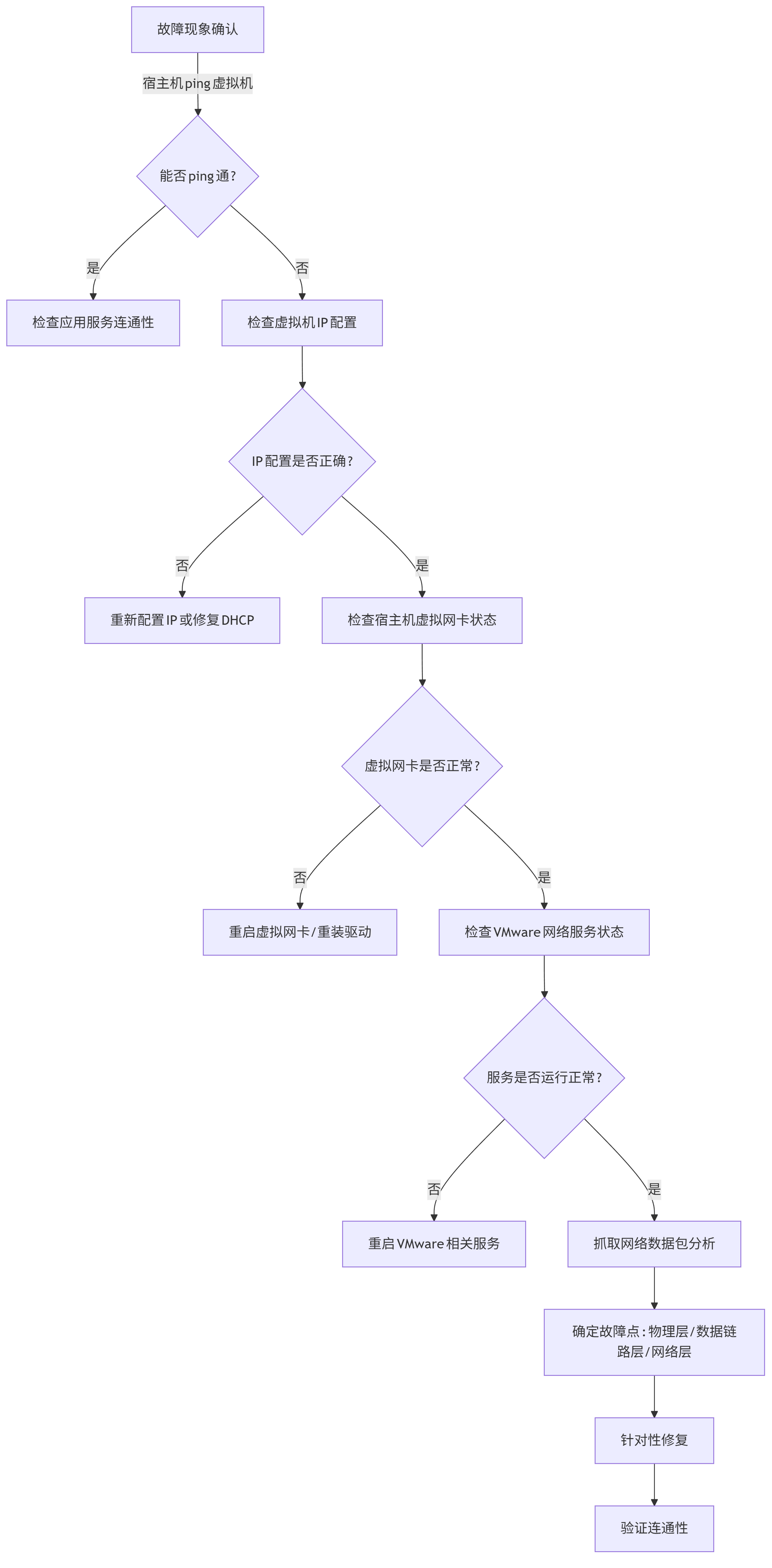 graph TD A[故障现象确认] -->|宿主机ping虚拟机| B{能否ping通?}; B -->|是| C[检查应用服务连通性]; B -->|否| D[检查虚拟机IP配置]; D --> E{IP配置是否正确?}; E -->|否| F[重新配置IP或修复DHCP]; E -->|是| G[检查宿主机虚拟网卡状态]; G --> H{虚拟网卡是否正常?}; H -->|否| I[重启虚拟网卡/重装驱动]; H -->|是| J[检查VMware网络服务状态]; J --> K{服务是否运行正常?}; K -->|否| L[重启VMware相关服务]; K -->|是| M[抓取网络数据包分析]; M --> N[确定故障点:物理层/数据链路层/网络层]; N --> O[针对性修复]; O --> P[验证连通性];