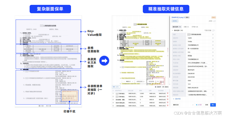 具备强大的复杂版式适配与解析能力,可精准应对不同行业企业的各类复杂业务文档,无论是空运行业NRC文档中普遍存在的少线表、无线表、合并单元格等不规则表格,还是保险资管行业常见的扫描件、图像PDF、嵌套表头、模糊水印、倾斜文档等,都能对文档版面布局进行深度理解,智能优化文档图像质量,完整还原表格逻辑与文本结构,破解传统技术解析准确率低、适配性差的痛点,为信息抽取奠定基础。