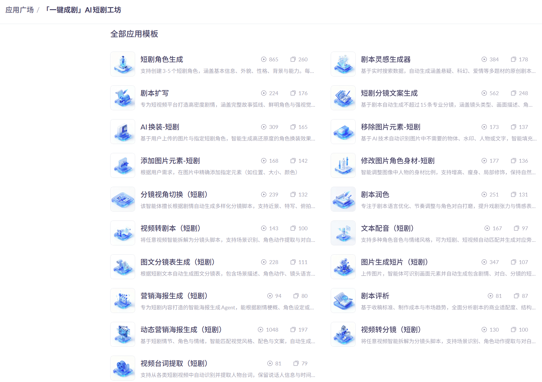 除了上面展示的动态营销海报生成(短剧),它还包括了近 20 个应用模板。