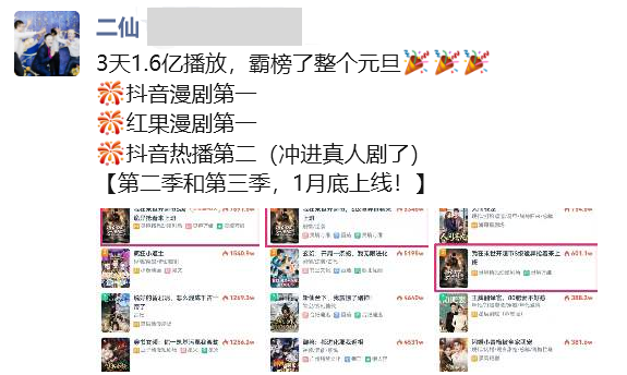 元旦假期期间,连续 3 天霸榜抖音漫剧第一、红果漫剧第一,甚至冲进真人剧,抖音热播第二。
