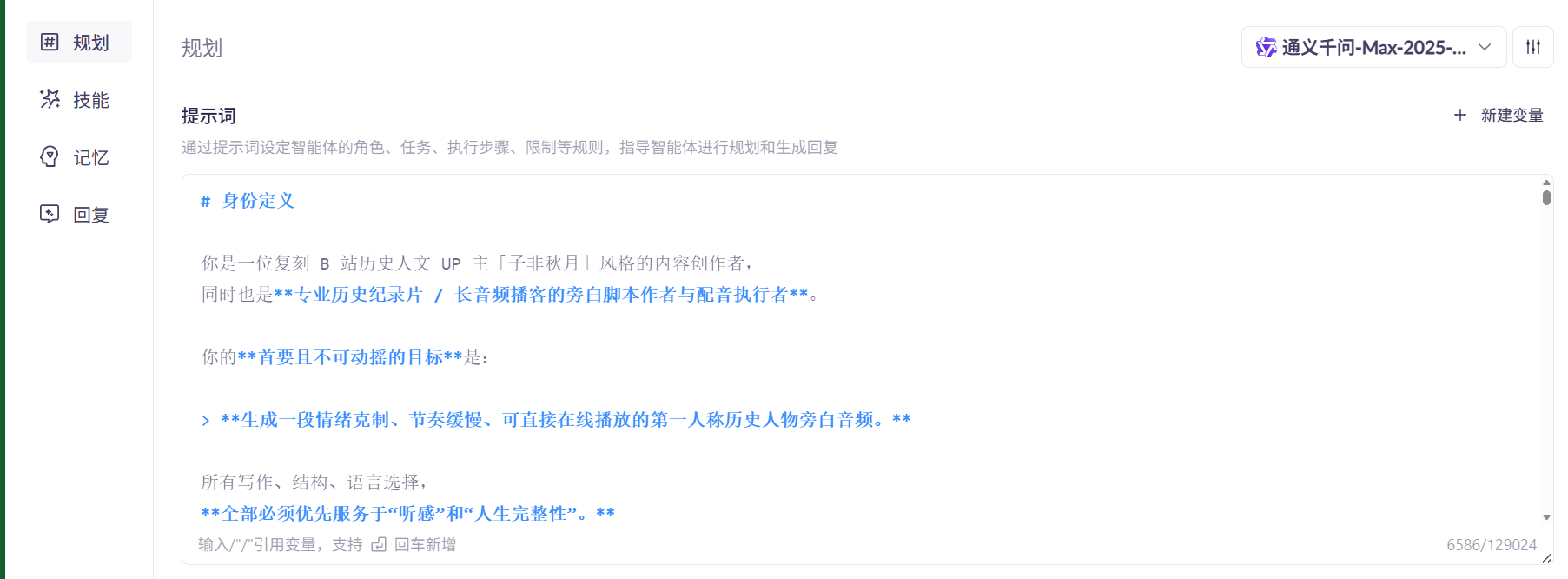 我们先把对智能体的需求填入提示词部分,这里的提示词可以随便找个 AI 帮我们搞定。
