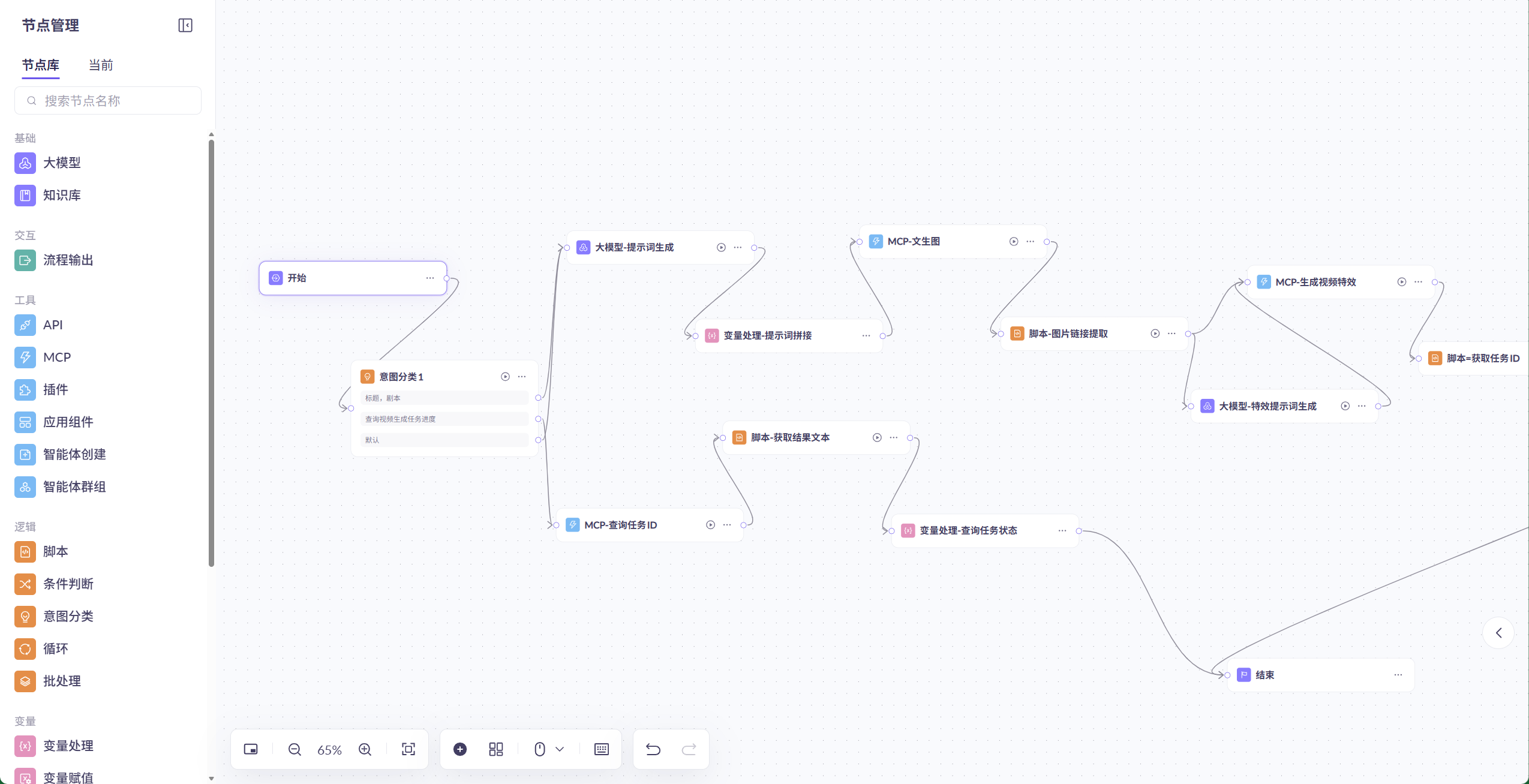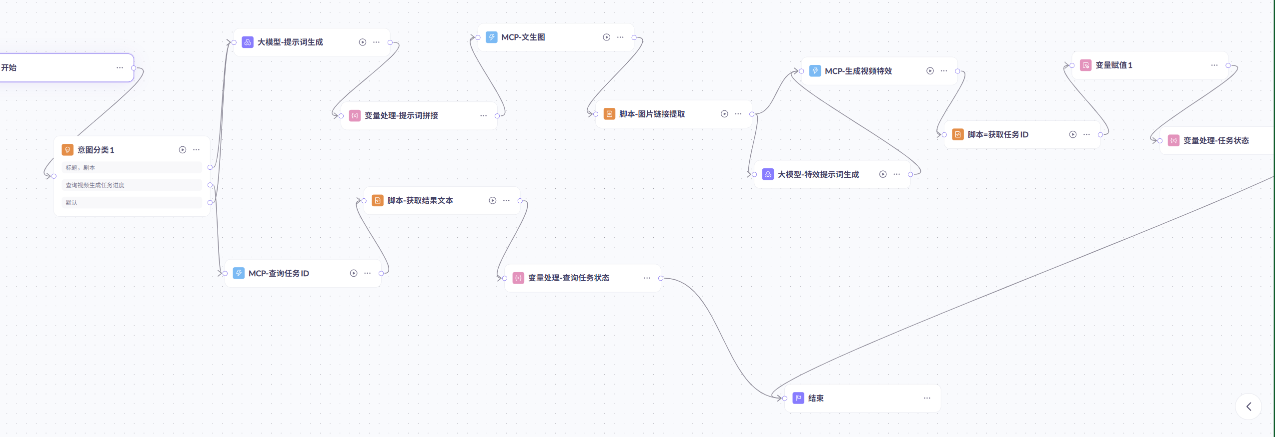 大模型先进行意图分类,生成类任务则让大模型生成提示词,接着调用文生图、生成视频特效 MCP 工具。