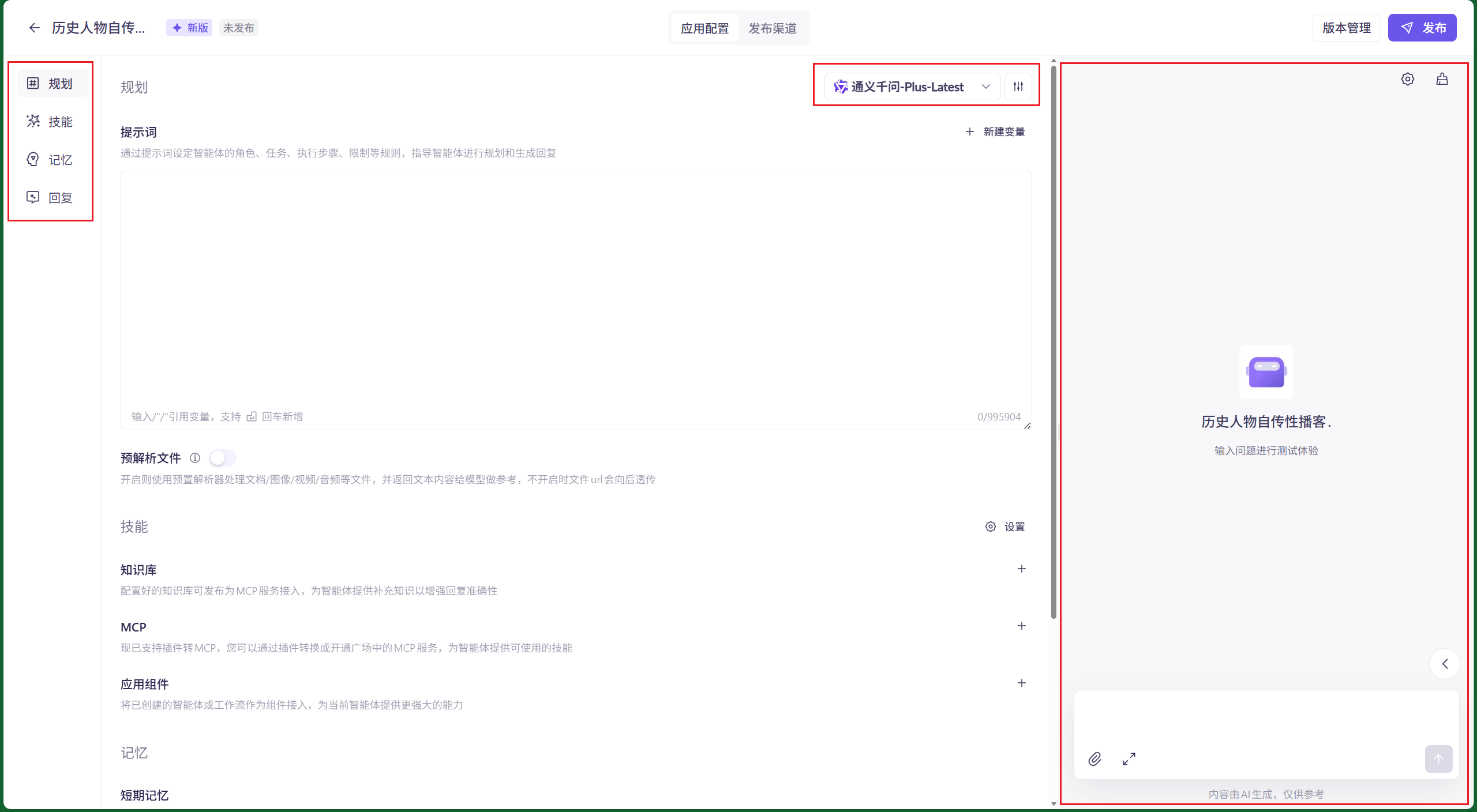 左边工作栏中包括了对智能体的规划、技能、记忆、回复设置。