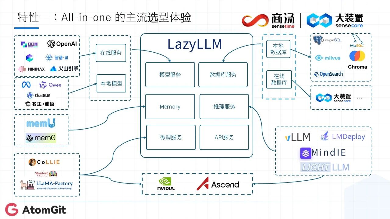 不用再为模型、数据库选型纠结!LazyLLM内部整合了主流模型厂商(商汤科技、火山引擎、阿里百炼、硅基流动等)、在线/本地数据库服务。