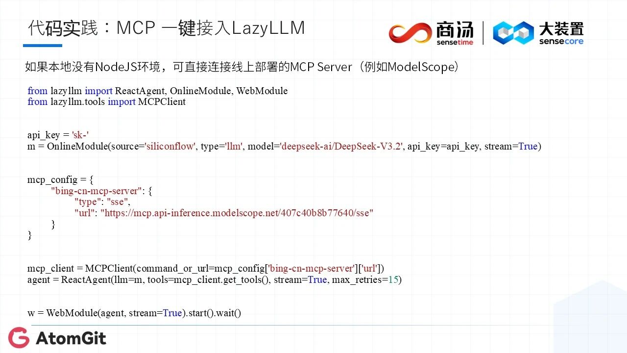 无论是简单的任务执行,还是多工具协同的复杂场景,都能以。通过统一的OnlineModule,一行代码即可调用文本生成、视觉模型、Embedding向量、文生图等各类模型,切换厂商或模型类型无需修改核心逻辑,极大降低试错成本。一行代码搞定大模型应用:从环境安装、API密钥申请,到模型调用、RAG系统搭建、Agent创建,全程代码演示,手把手教大家快速落地AI应用。以RAG系统为例,仅需十余行代码,即