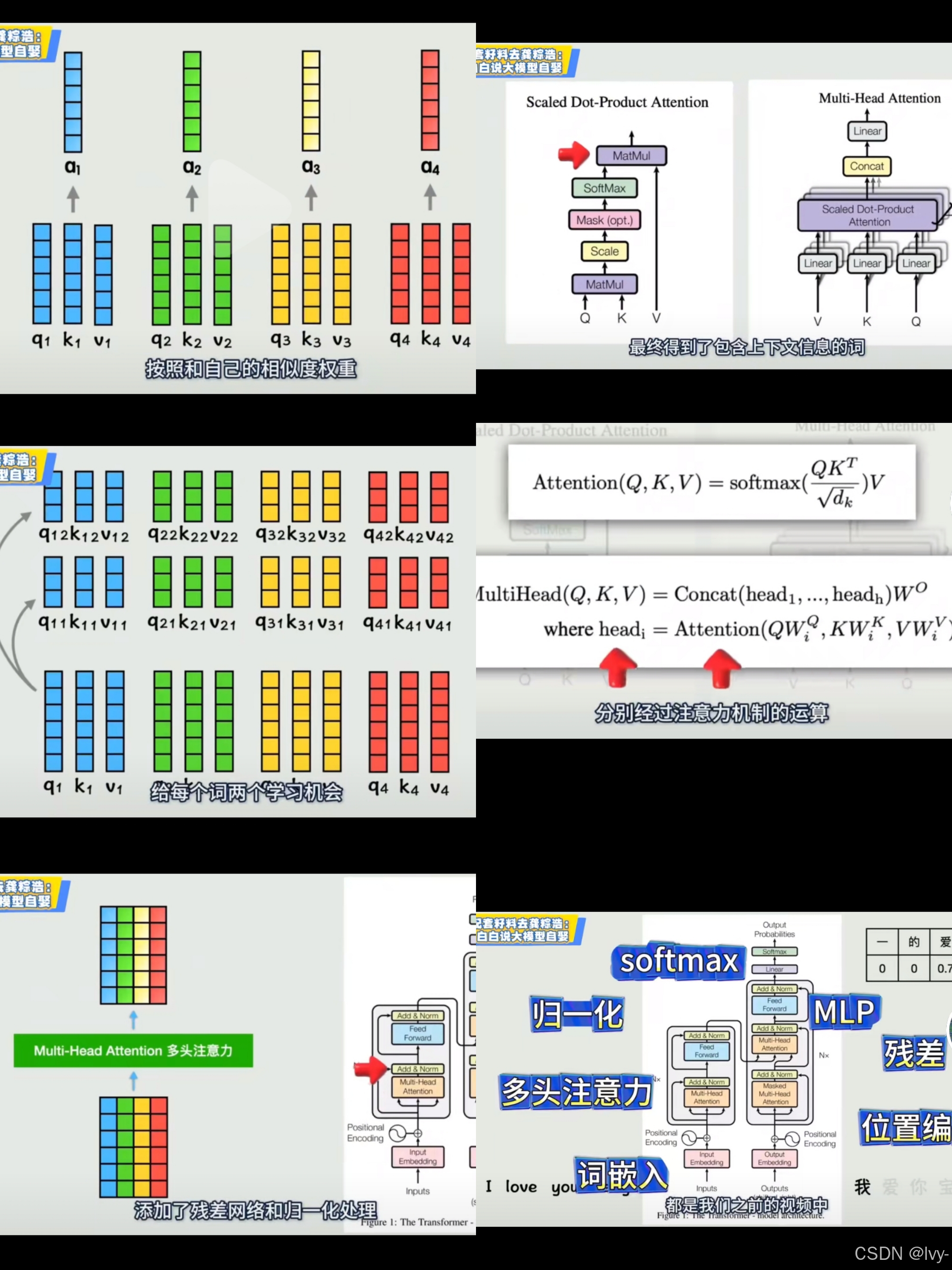 Transformer之所以强大,核心在于自注意力机制(Self-Attention Mechanism) 与并行计算的突破,叠加多头注意力、残差连接+层归一化、编码器-解码器架构、可扩展性等设计,彻底解决传统序列模型痛点,成为大模型基础。# 2. 缩放点积注意力 (B,nh,L,dk) @ (B,nh,dk,L) -> (B,nh,L,L)# 3. 注意力加权+多头拼接 (B,nh,L,L) @