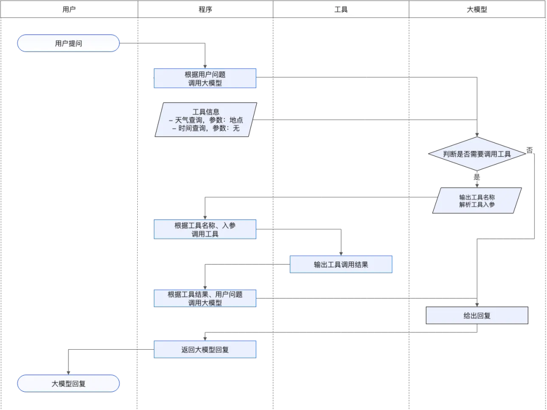 需工具调用:LLM输出工具名称及参数(如WeatherAPI: {location: "上海"})。