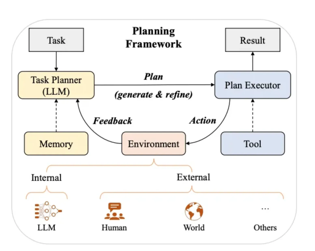 主要有规划、记忆、工具、执行模块(后两者结合可以理解为工具使用)。而完成这些操作的底层控制中枢,类比人可以理解为是人的大脑,在AI领域则是大模型充当了这一角色。