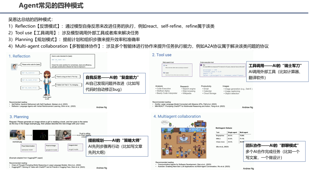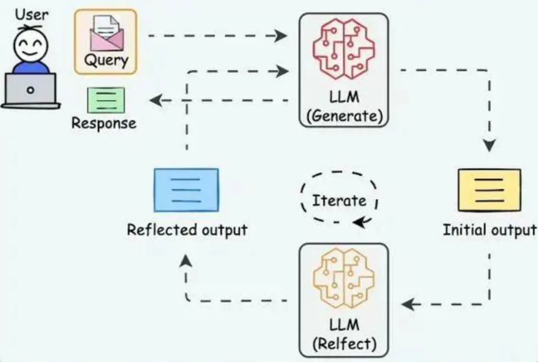 - Reflection【反思模式】:通过模型自身反思来改进任务的执行,例如react、self-refine、refine属于该类