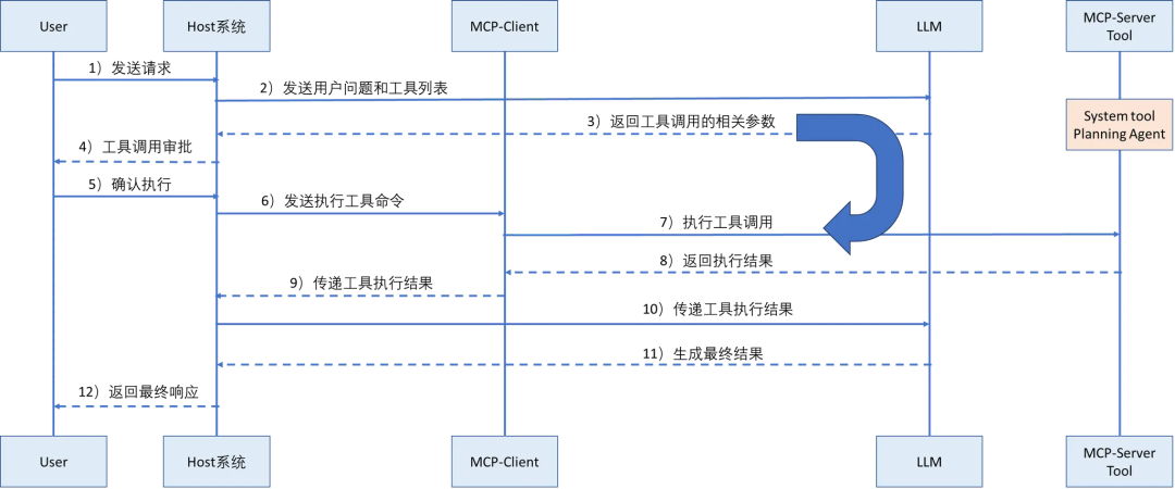 12) Host系统→User Host系统将LLM生成的最终响应返回给用户,完成闭环。流程中MCP协议通过标准化接口和审批机制,确保多主体间安全、高效的协同。
