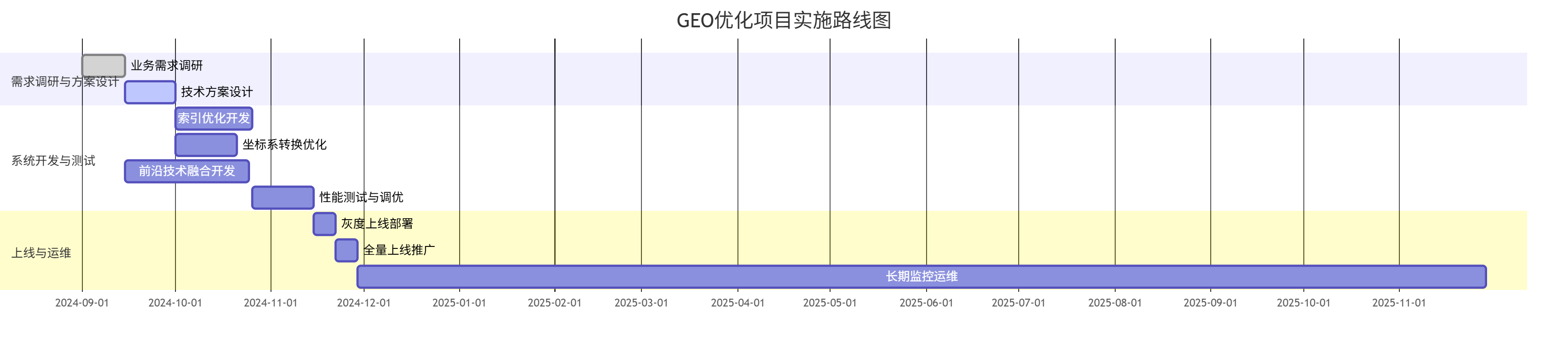 业务需求调研技术方案设计前沿技术融合开发索引优化开发坐标系转换优化性能测试与调优灰度上线部署全量上线推广长期监控运维需求调研与方案设计系统开发与测试上线与运维GEO优化项目实施路线图