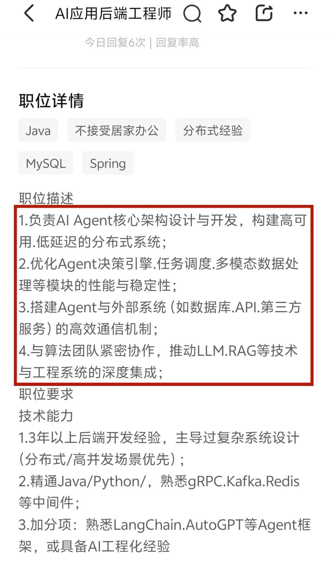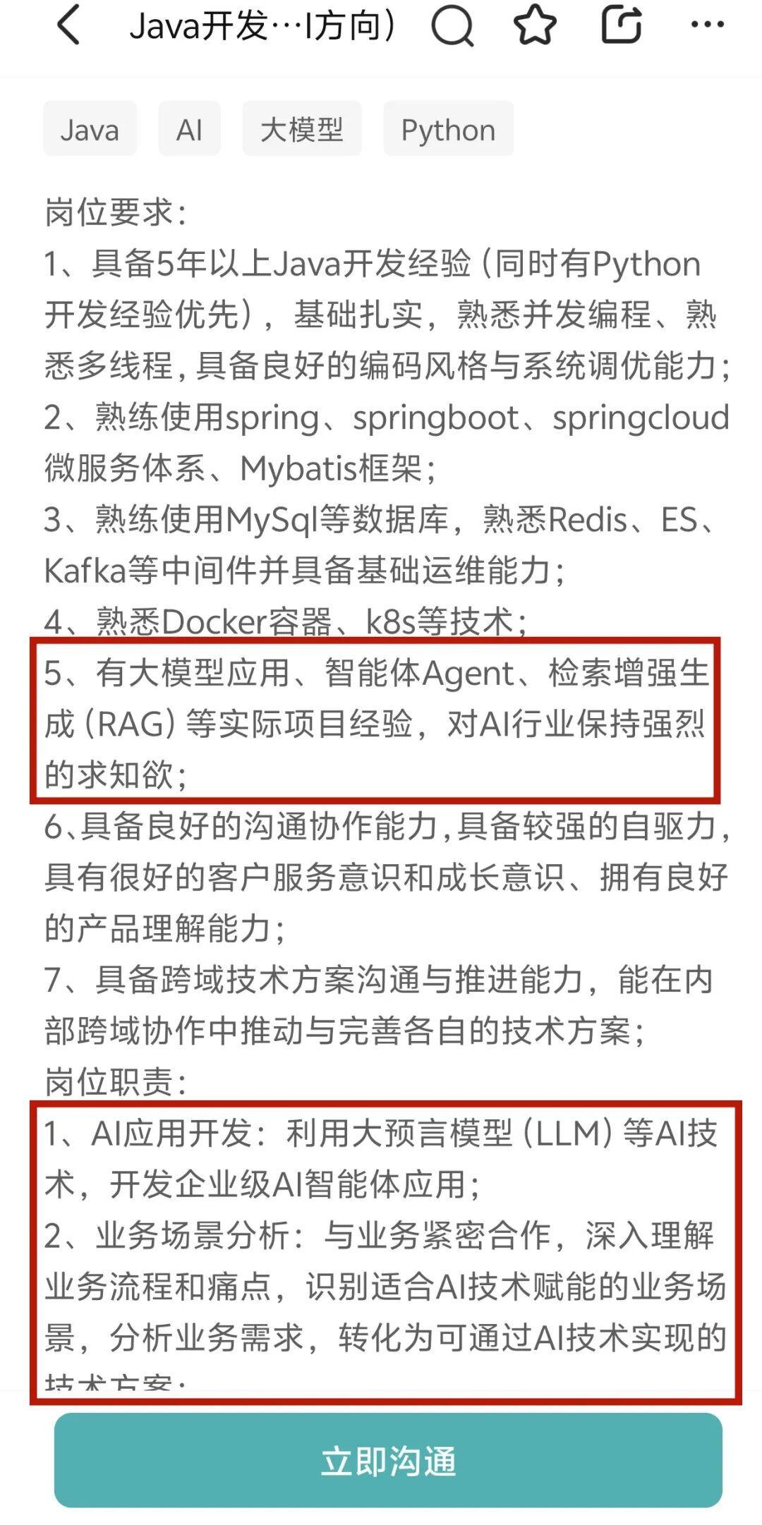 随手翻开招聘平台的岗位需求就能发现,当你还在机械地重复 “CRUD 开发 + 分布式锁调试” 的传统工作流程时,企业真正渴求的,早已是 “既能搞定高并发系统架构,又能独立构建 AI Agent 应用” 的复合型双料人才。就像某头部电商企业,近期招聘 Java 工程师时明确要求,候选人需能基于 Java 技术栈搭建支持百万级用户的交易系统,同时还要会利用大模型开发智能客服 Agent,实现用户问题的自动响应与解决。