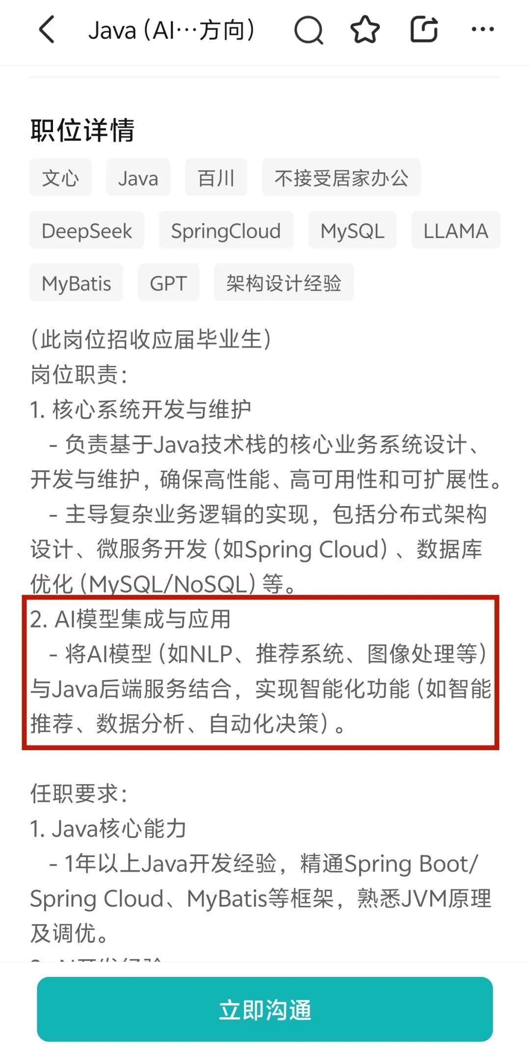 还在靠 “微服务搭建 + 高并发处理” 勉强撑住简历的竞争力?以为略懂 SpringAI 的基础用法,就能稳稳拿到心仪企业的 offer?快从这种认知里清醒过来!如今企业的招聘需求早已迈入 AI 化的超级迭代阶段,传统技能栈早已跟不上市场节奏。你觉得 Java 行业卷,或许只是因为还在固守陈旧的技术体系,而真正有远见的从业者,早已瞄准 AI 时代的红利赛道,大步向前抢占先机!