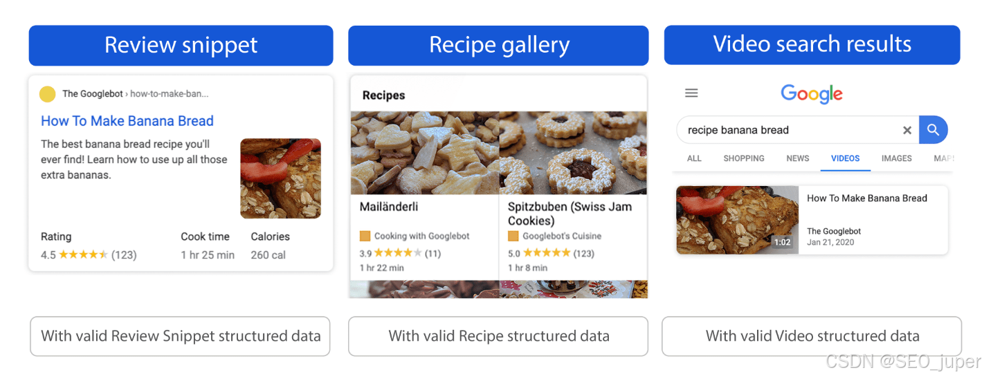 得益于SEO中不同类型的结构化数据,丰富的结果可以显示一系列功能,包括评分、搜索栏、食谱的卡路里、书籍作者等等。