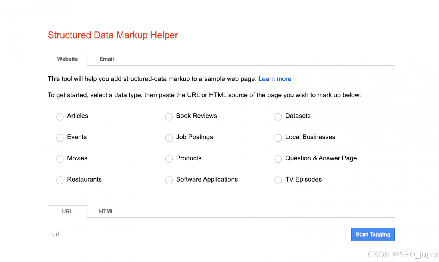 使用该工具时,你需要选择标记数据类型(文章、产品、电影、活动等),指定页面URL或HTML代码。然后,选择页面的片段,赋予它们数值,点击创建HTML。了解更多关于如何使用谷歌标记工具的信息。