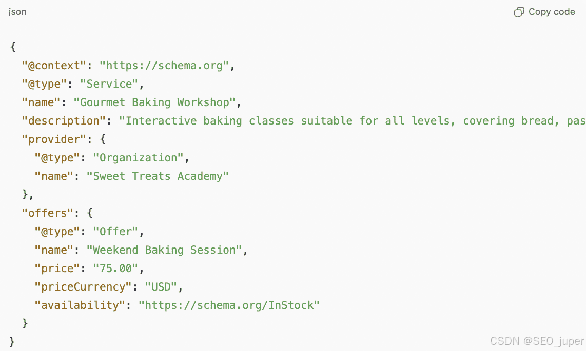 示例提示:“为名为’Gourmet Baking Workshop’的服务生成schema标记。请附上描述:“适合各水平的互动烘焙课程,涵盖面包、糕点和甜点。”提供者是’甜点学院’,还有一个叫’周末烘焙时段’的优惠,售价75美元。”