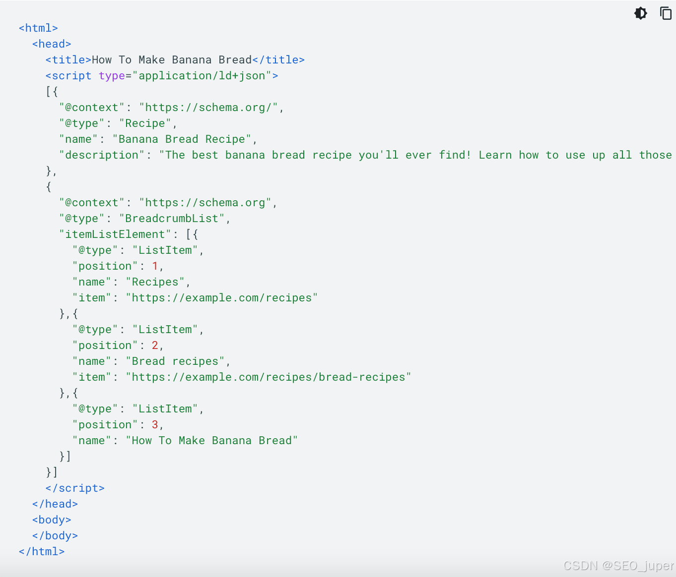 请看下面的结构化数据示例,显示同一页面上两个不同的项目:Recipe和BreadcrumbList。