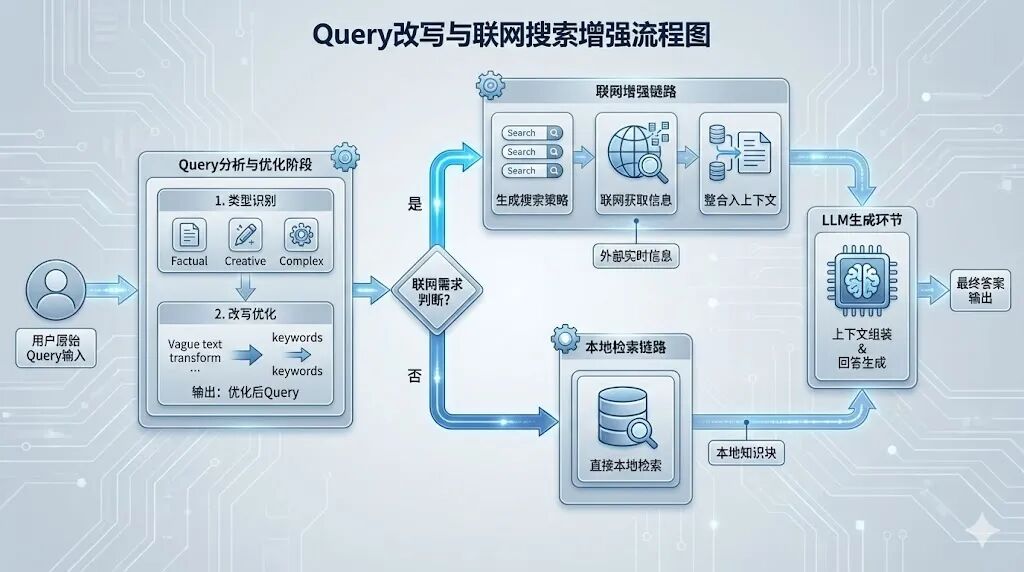 对于实时性、动态性知识(如天气、价格、活动),本地知识库无法覆盖,需通过“联网需求识别→Query改写→搜索策略生成→结果整合”增强RAG能力。