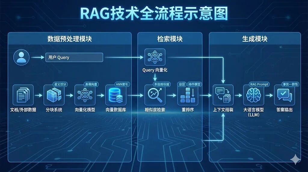 RAG的核心思想是“让模型只做擅长的生成任务,将知识存储与检索交给专业体系”,整体流程分为数据预处理、检索、生成三大核心步骤,形成闭环链路。