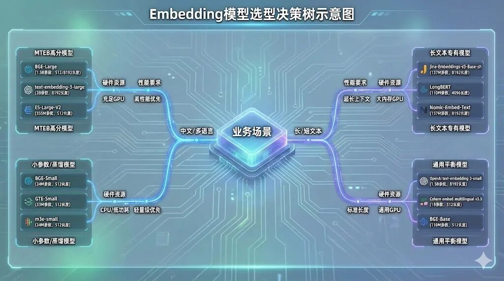 Embedding模型是RAG的“语义基石”,其性能直接决定检索精度。选型需结合业务场景(语言类型、文本长度)、硬件资源(显存、算力)、性能要求综合判断。