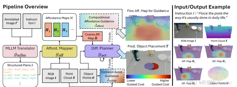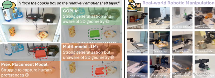 机器人智能(具身智能)的重要目标之一是让机器能像人一样在物理世界中自主、合理地行动。而"物体放置"是检验其智能水平的关键环节。其核心挑战在于:如何让机器同时理解人类模糊的语义指令("放得顺手点")和精确的物理几何约束("不能碰到其他东西")?