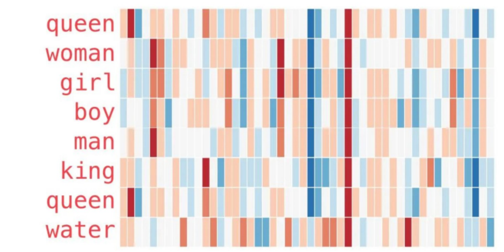 - 上面的单词中,除了 water 其他的都和人相关,并且向量的倒数第三个元素是一个蓝色的色块,来到 water 这里却消失了。