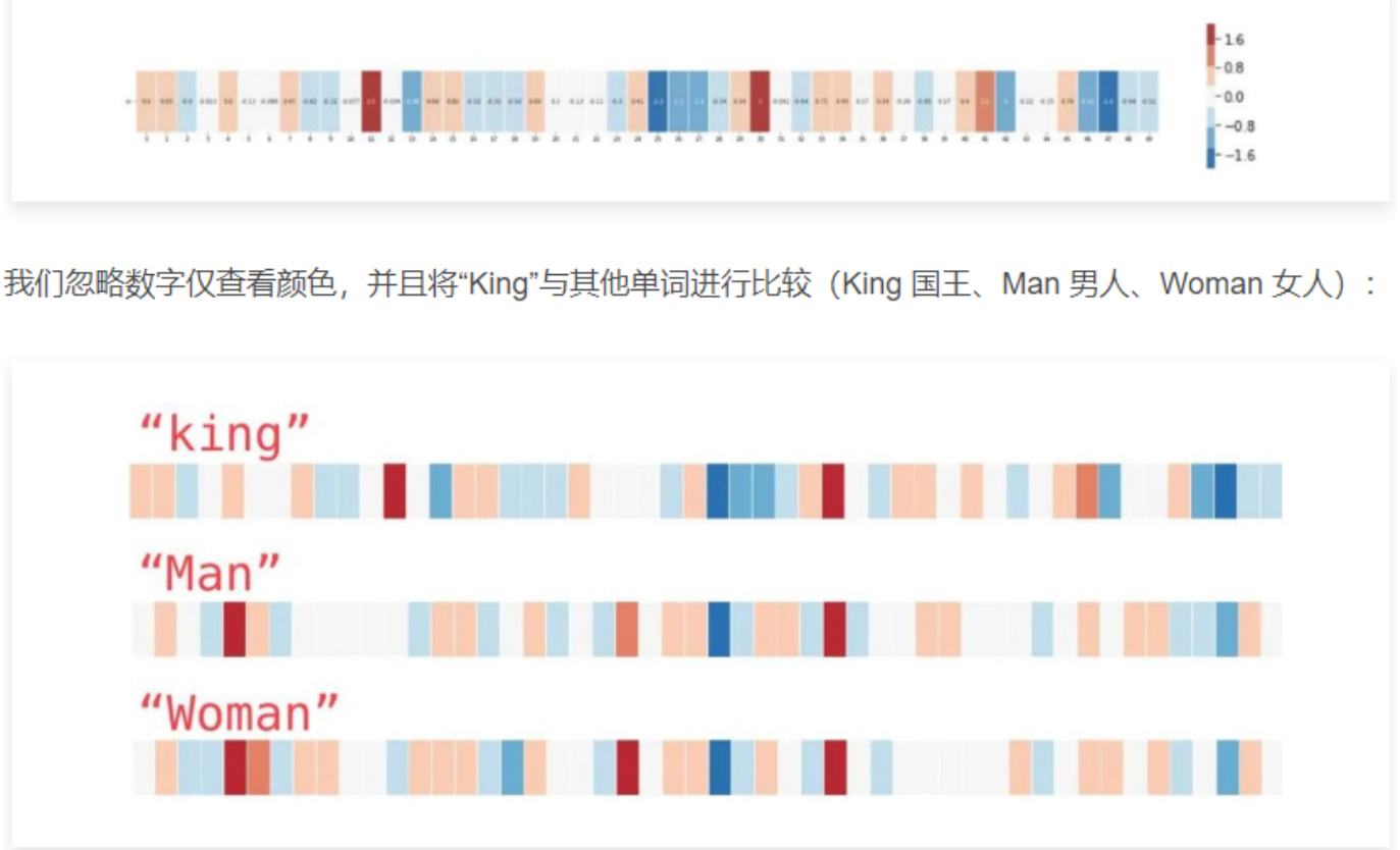 - 这几个单词的词向量在中间都有一条直的红色列,代表它们在这个维度上是相似的,但是从数值来看我们看不出这个维度是什么。