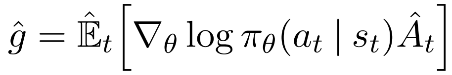 先计算策略梯度的估计值(形式如下 g),再将其代入随机梯度上升算法中完成优化。