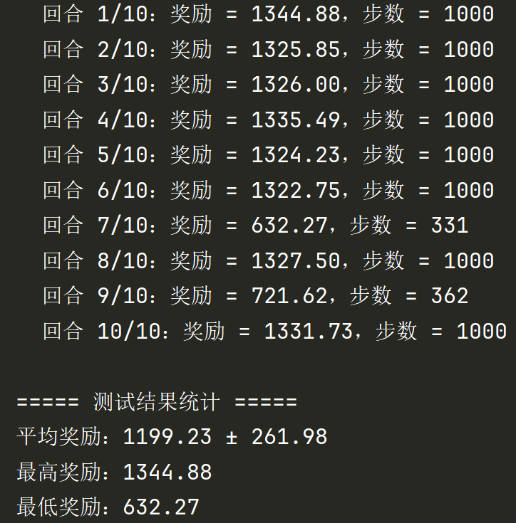 print(f" 回合 {episode + 1}/{N_TEST_EPISODES}:奖励 = {episode_reward:.2f},步数 = {steps}")