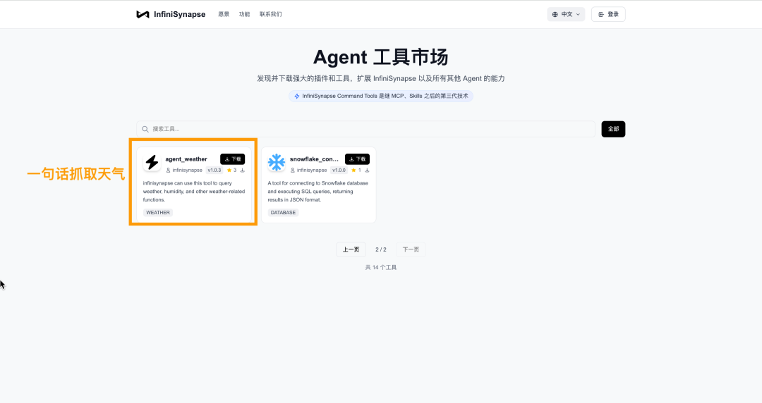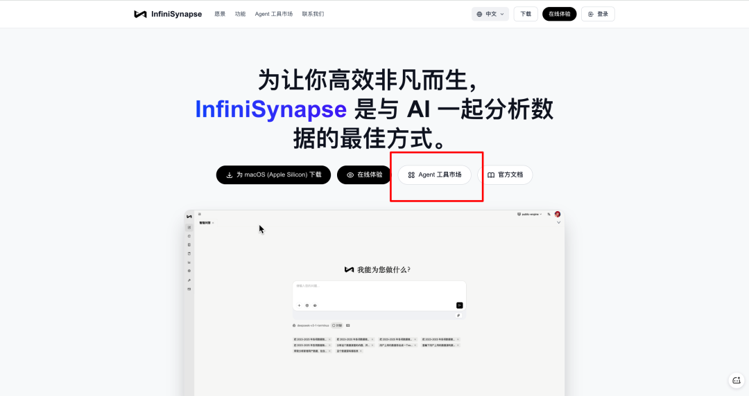 Step 1:登陆我们的官网https://www.infinisynapse.cn/ ,在首页就能看到【Agent工具市场】的入口啦。