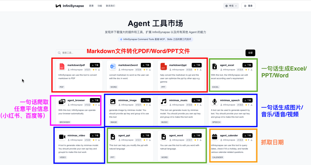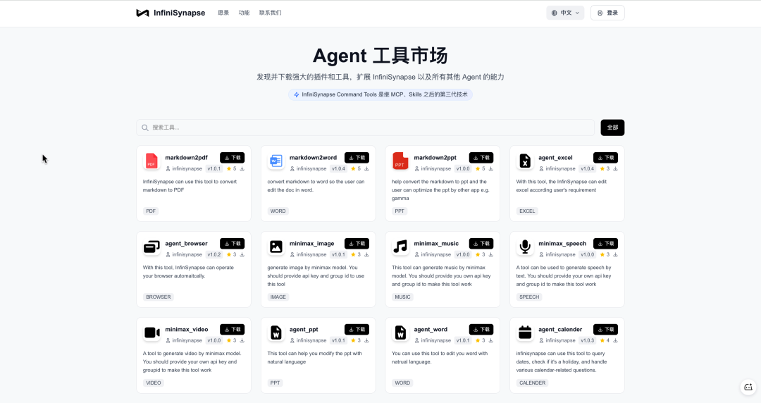 我们相信,好的工具就应该实实在在地解决问题。所以,我们首批开放了14款大家高频使用的AI工具,只要注册,就能 永久免费 使用。更重要的是,我们秉持开放的理念,这些工具下载后不仅能在 InfiniSynapse 上使用,也同样兼容其他主流的Agent平台,真正做到“一次获取,处处可用”。希望能覆盖你从办公到创作的方方面面: