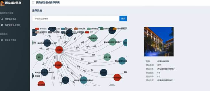 知识图谱驱动的高效查询:通过构建详尽的知识图谱,系统能够直观地展示西安各个景点之间的关联、历史背景及文化内涵。用户只需输入简单的查询关键词,系统即可迅速定位并返回相关信息,极大地提高了查询效率。例如,用户可以查询“华清宫临近哪些景点”,系统会立即展示出华清宫临近景点的相关信息。