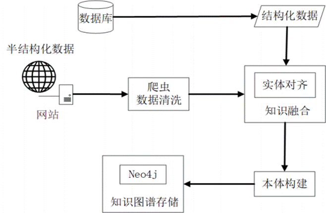 对于知识图谱的构建任务来说,数据源可以由结构化数据、半结构化数据及 非结构化数据组成,对于应用结构化数据做为源数据来构建知识图谱,人们一般 采用 D2R 转换技术,对于应用纯文本数据即非结构化数据做为源数据时,则要 用到信息抽取技术,如命名实体识别技术、属性抽取技术以及关系抽取技术。本文构建知识图谱的原始数据由外部数据库以及网站数据组成,对应知识图 谱的构建过程如下图 3.1 所示。
