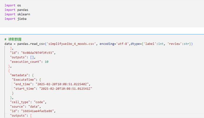 在系统中,为了建立决策树模型进行预测,首先需要获取相关的数据。首先,通过导入必要的库(如os、pandas、sklearn和jieba),为后续的数据读取和处理做好准备。接着,使用pandas库的read_csv函数读取名为'simplifyblbl_4_moods.csv'的CSV文件,该文件包含了文本及其对应的预测。在读取数据时,指定了编码为'utf-8'以确保正确处理中文字符,并通过dtype参数明确了'label'字段为整数类型,'review'字段为字符串类型,以保证数据的准确性和一致性。读取完成后,数据被存储在名为data的DataFrame对象中,便于后续的数据清洗、特征提取和模型训练。此过程为系统的预测任务提供了坚实的数据基础,确保了后续分析的有效性和准确性。
