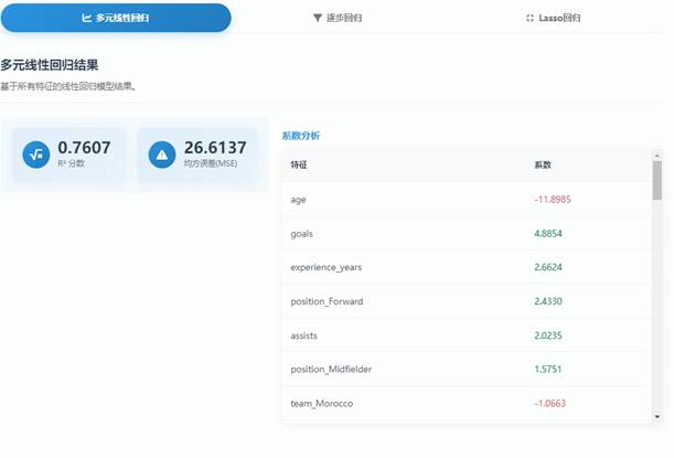 回归分析界面是球员数据分析项目中的一个核心部分,它包含了多个功能模块来帮助用户深入挖掘球员数据的价值。首先,多元线性回归结果模块展示了基于所有特征的线性回归模型的结果,其中包括R²分数和均方误差(MSE),分别反映了模型的拟合优度和预测精度。其次,系数分析模块列出了各个特征变量及其对应的回归系数,这些系数表明了每个特征对球员身价的贡献程度,正负号则指示了这种影响的正向或负向关系。此外,该模块还可能包括显著性检验的信息,以判断哪些特征对球员身价有显著影响。最后,逐步回归和Lasso回归选项卡提供了不同的回归分析方法,使用户可以根据需要选择最适合的模型来进行分析。通过这些功能模块的综合运用,用户可以更准确地理解球员身价的驱动因素,并进行有效的预测和决策。回归分析界面如图5-5所示: