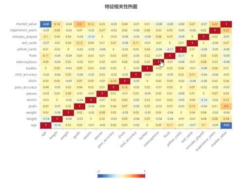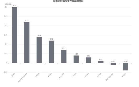 与市场价值相关性最高的特征柱状图是通过计算各个特征变量与市场价值之间的相关系数来实现的。首先,收集足球运动员的相关数据,包括市场价值、进球数、经验年限、身高、助攻数、红黄牌数、射门次数、传球次数、抢断次数、射门准确率和体重等特征变量。然后,利用统计学方法,计算每个特征变量与市场价值之间的相关性。最后,将计算出的相关系数作为y轴,特征变量作为x轴,绘制柱状图,从而直观地展示各个特征变量与市场价值的相关性,找出与市场价值相关性最高的特征。与市场价值相关性最高的特征界面如图5-4所示: