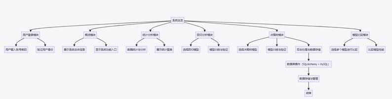 首先,前后端交互方面,系统采用Vue.js构建前端界面,利用Flask框架搭建后端服务。前端通过Ajax技术与后端进行异步数据交互,确保用户能够实时获取数据并查看分析结果。用户在登录后,前端界面将提供概览、统计分析、回归分析、决策树和模型比较等功能模块的入口。用户选择相应的功能模块后,前端将发送请求至后端,后端接收到请求后,将调用相应的Python脚本进行处理,并将结果返回给前端进行展示。