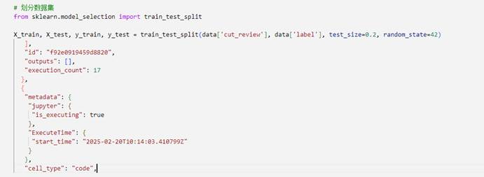 首先,通过导入train_test_split函数,为后续的数据集划分做好准备。接着,使用该函数将预处理后的数据集data中的cut_review列(即分词后的文本)作为特征集X,label列(即预测)作为目标集y进行划分。在划分过程中,指定了测试集的比例为0.2,即20%的数据将被用作测试集,剩余80%的数据用作训练集。同时,通过设置random_state=42确保了划分的随机性可复现,这对于后续的实验对比和结果分析具有重要意义。